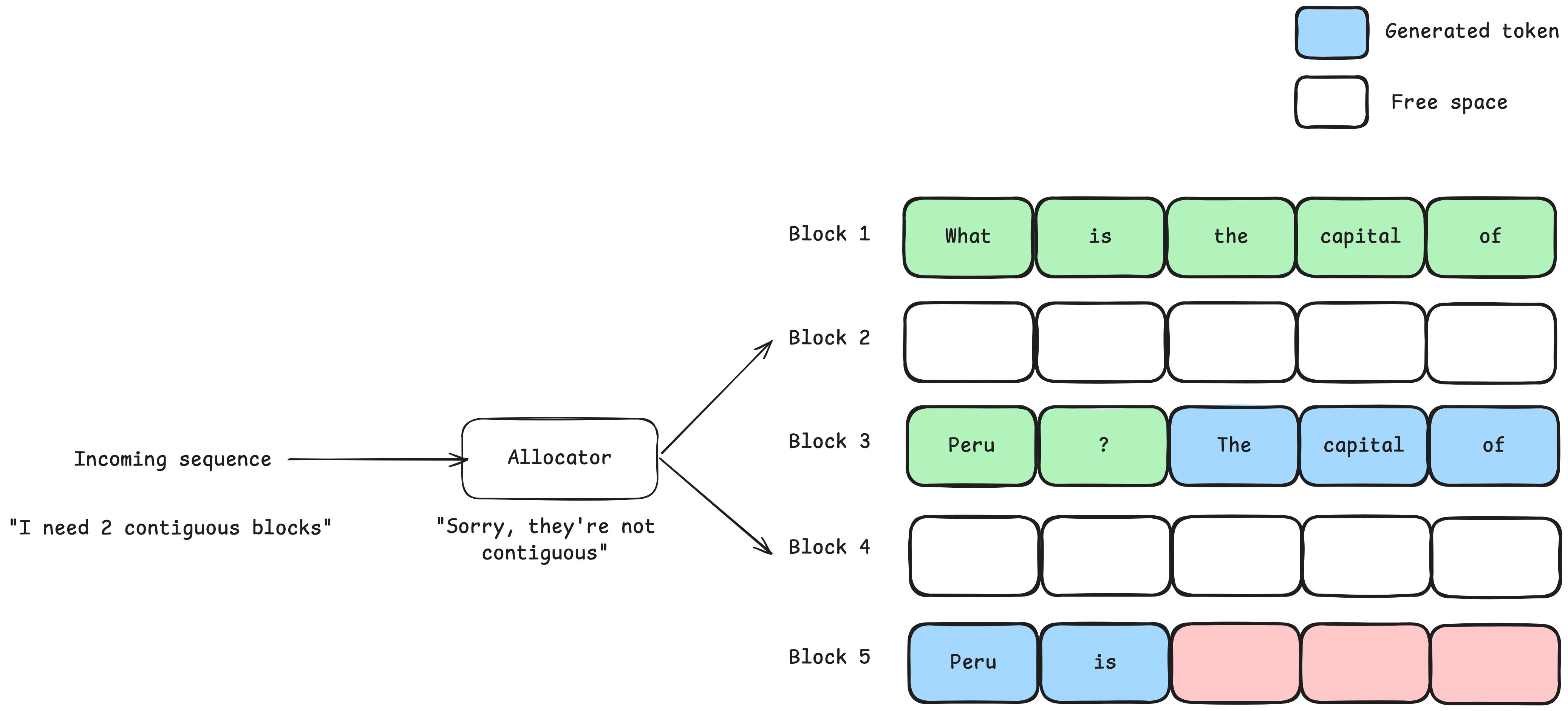 However, blocks are not necessarily contiguous to one another, which would lead to yet another issue known as external fragmentation. This happens when a new incoming sequence asks for memory blocks, yet not enough contiguous blocks are available. So the sequence could not be processed, although there is enough memory available on the GPU. A naïve solution would be to enforce contiguity between blocks but it would not be possible as sequences lengths are not known in advance.
